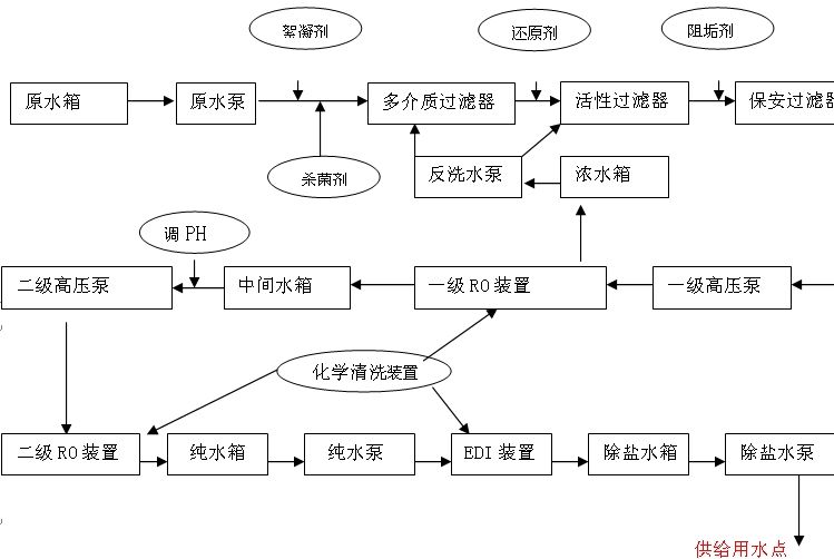 原水箱 → 增壓泵 → 砂濾器 → 碳濾器 → 軟水器 → 保安過濾器 ↓ EDI增壓泵 ← 二級純水箱 ← 二級RO主機 ← 一級純水箱 ← 一級RO主機 ↓ ↓ UV殺菌器 → 膜濾器 → EDI系統(tǒng) →超純水箱 →超純水泵 ↓ 用水點 ← 終濾器 ← UV殺菌器 ← 拋光混床