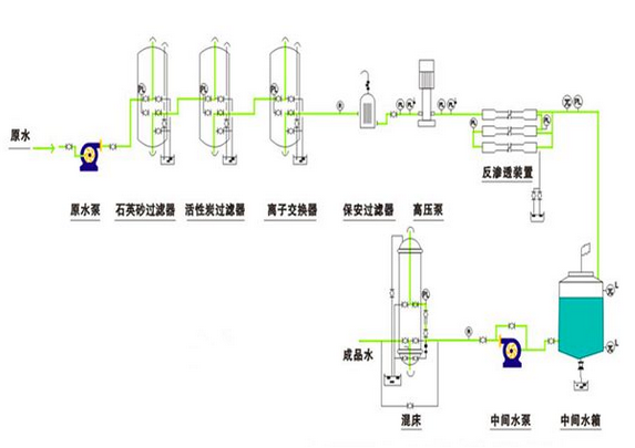 原水箱→原水泵→石英砂過濾器→活性炭過濾器→離子交換器→精密(保安)過濾器→反滲透高壓泵→反滲透純水箱純水泵混床DI離子水